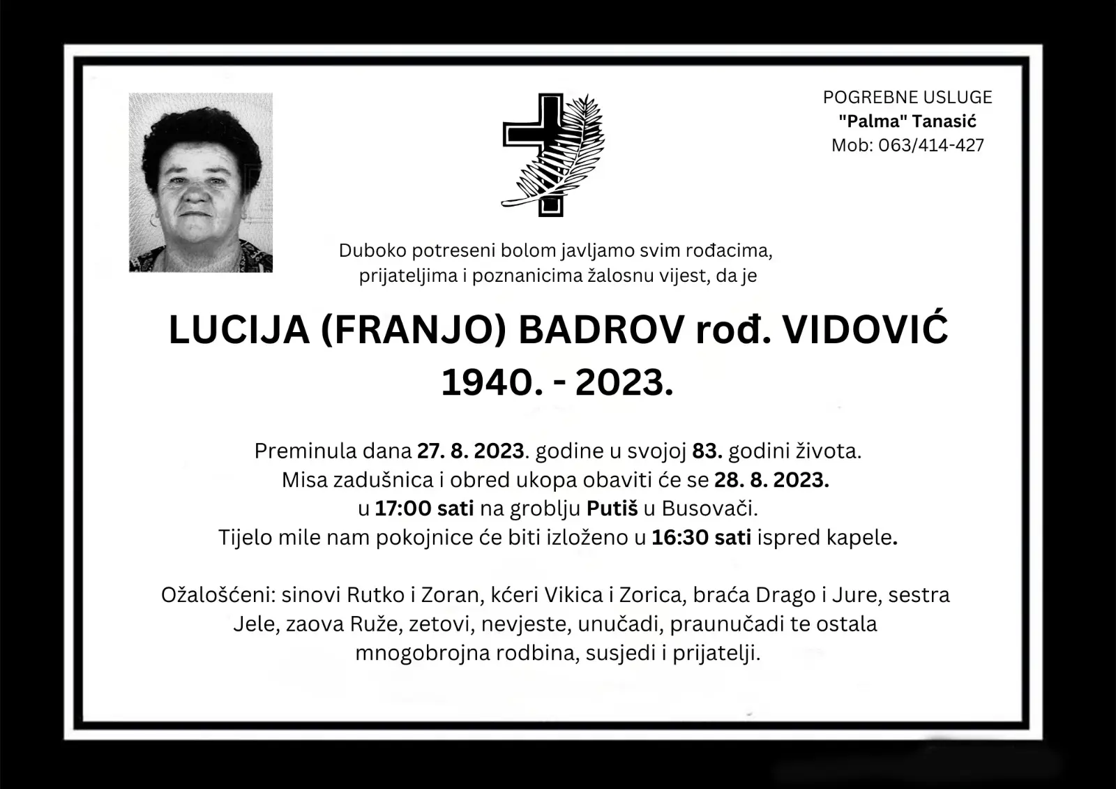 Tijelo mile nam pokojnice će biti izloženo u 16:30 sati ispred kapele. Ožalošćeni: sinovi Rutko i Zoran, kćeri Vikica i Zorica, braća Drago i Jure, sestra Jele, zaova Ruže, zetovi, nevjeste, unučadi, praunučadi te ostala mnogobrojna rodbina, susjedi i prijatelji.
