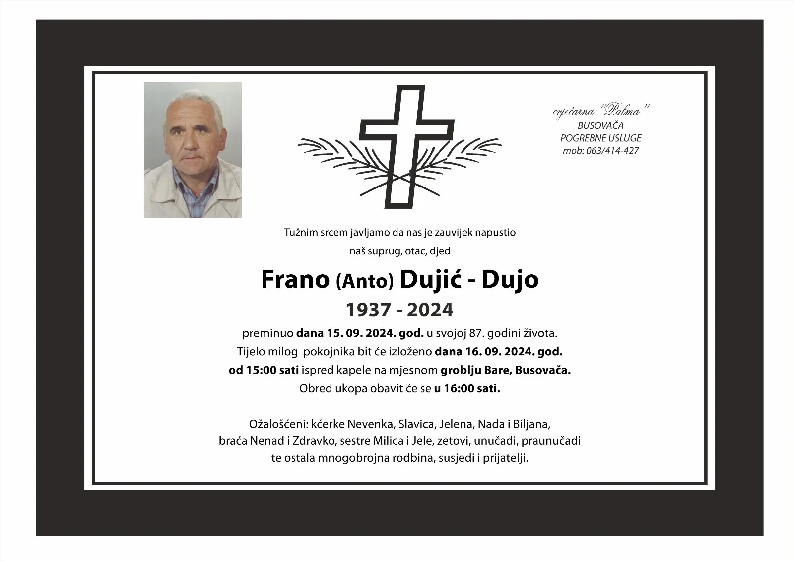 Tužnim srcem obavještavamo da nas je 15. rujna 2024. godine zauvijek napustio Frano (Anto) Dujić – Dujo u svojoj 87. godini života.