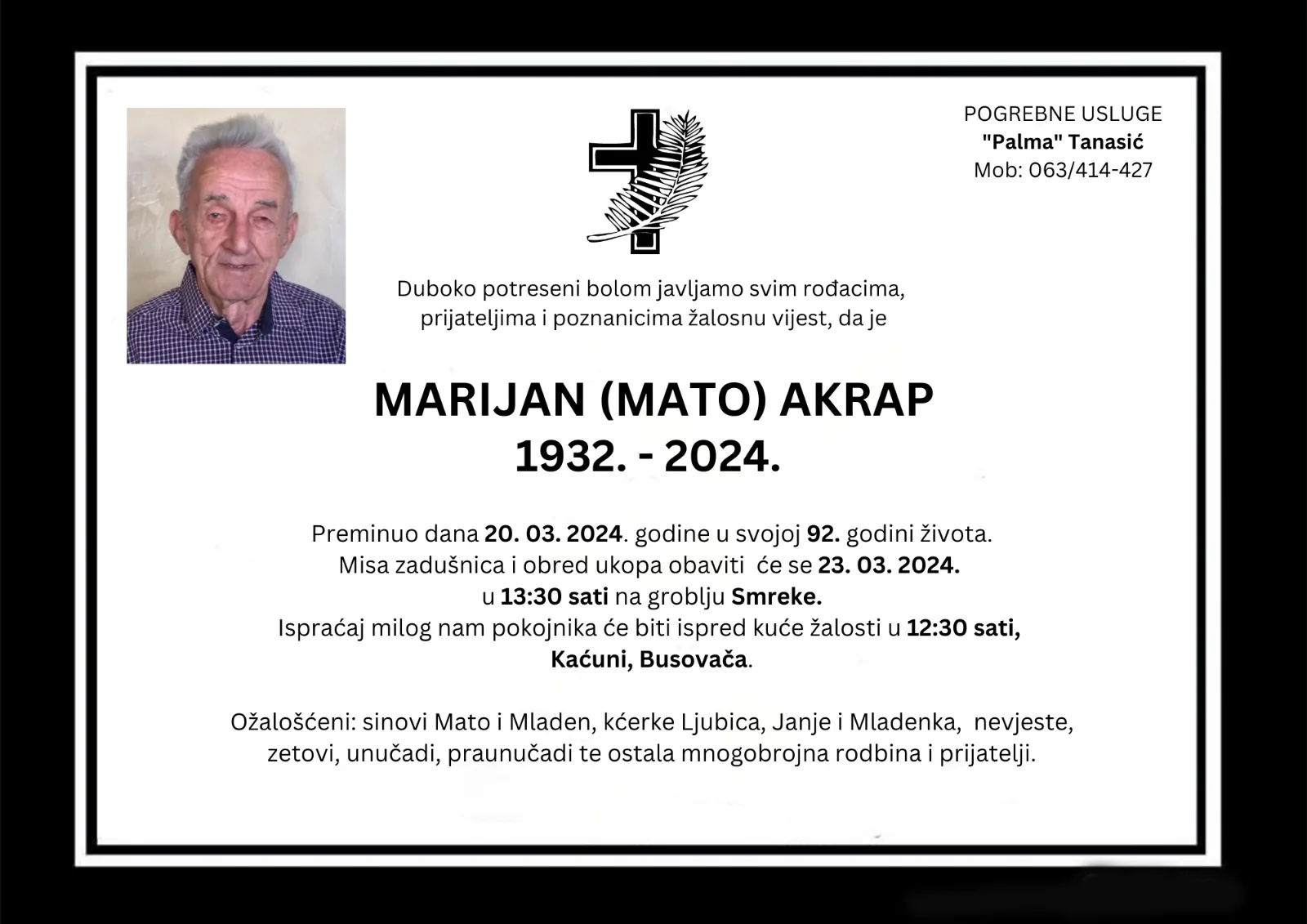 Duboko potreseni bolom javljamo svim rođacima, prijateljima i poznanicima žalosnu vijest, da je MARIJAN (MATO) AKRAP preminuo dana 20. 03. 2024. godine u svojoj 92. godini života.