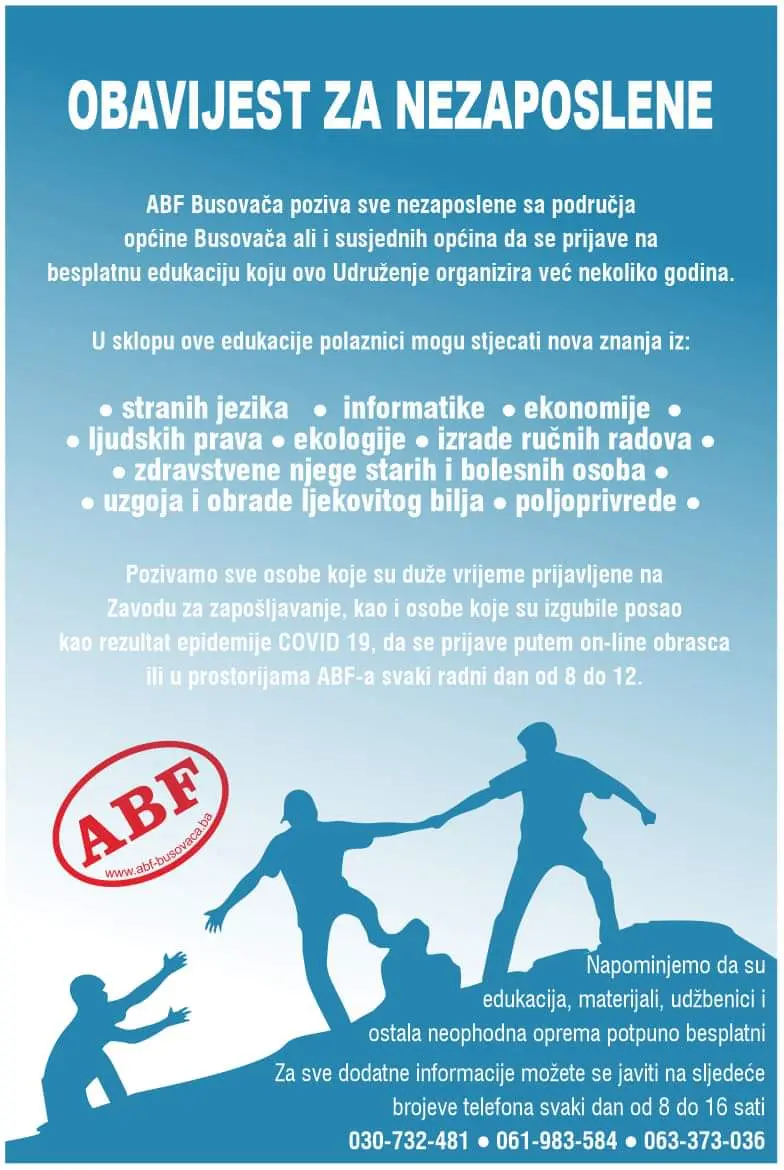 “ABF Busovača poziva sve nezaposlene sa područja općine Busovača, ali i susjednih općina (Vitez, Travnik, Novi Travnik, Kiseljak, Zenica) da se prijave na besplatnu edukaciju koju ovo Udruženje organizira već nekoliko godina u sklopu projekta Buso-Birka financirano od strane Olaf Palme Centra Stockholm.