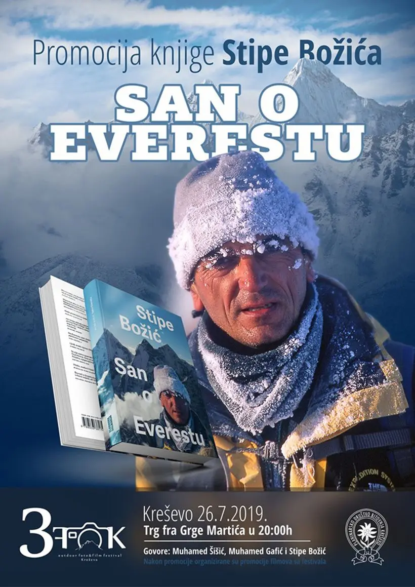 U petak je na rasporedu predavanje Nikoline Poljak – Izlet do base campa bez vodiča i nosača u 19 sati u vijećnici dok će na Trgu od 20 sati „nastupiti“ pravi planinarski velikani, Stipe Božić, Muhamed Gafić i Muhamed Šišić koji će ovom prilikom promovirati knjigu Stipe Božića San o Everestu. Nakon promocije bit će nastavljene projekcije filmova.