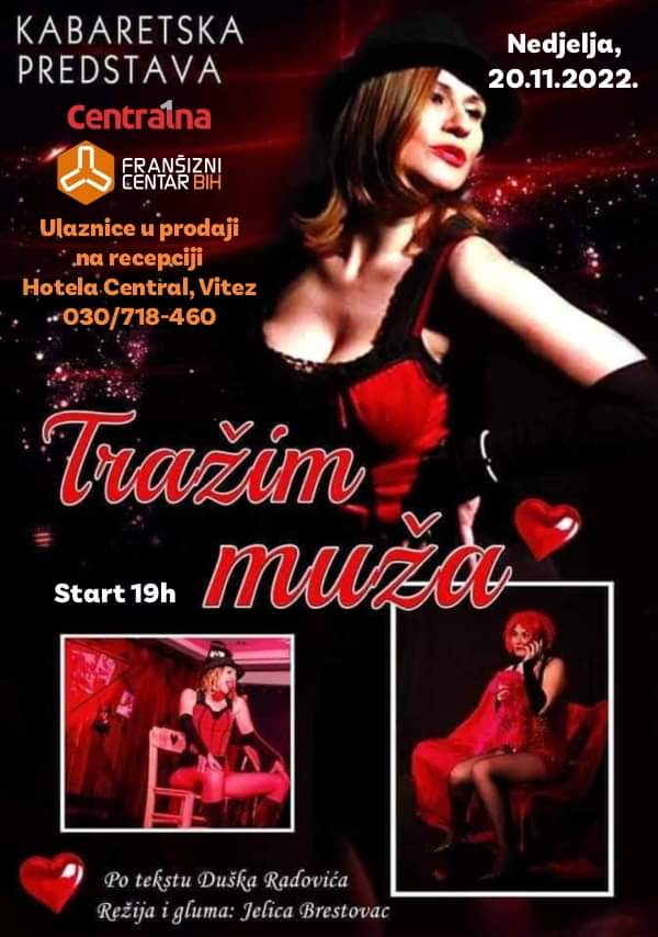 Urnebesna hit komedija „Tražim muža”, zbog velikog zanimanja i interesa publike održat će se u 20.11.2022. godine u Vitezu, u Franšiznom centru s početkom u 19 sati.