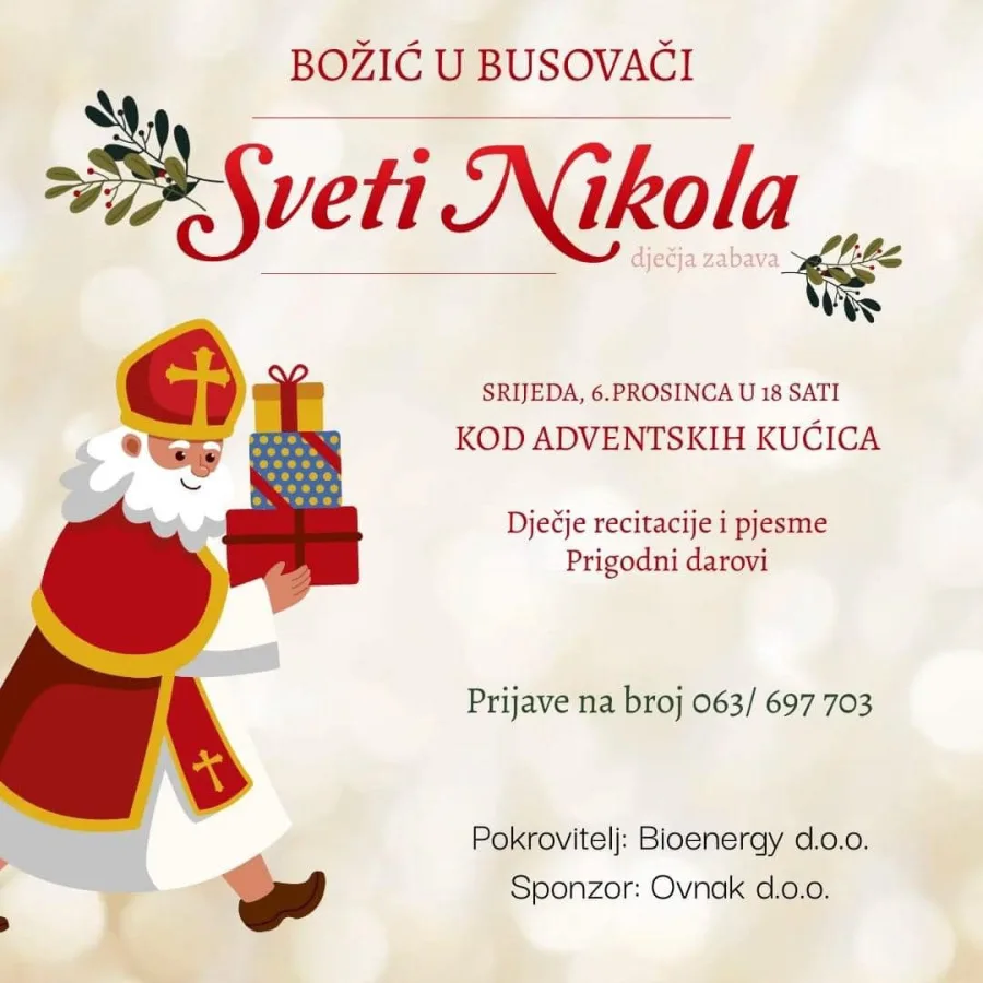 Večeras, 6. prosinca u 18.00 sati kod adventskih kućica, u sklopu manifestacije “Božić u Busovači”, bit će organizirana Dječja zabava u povodu blagdana sv. Nikole na kojoj će naši najmlađi recitirati i pjevati.
