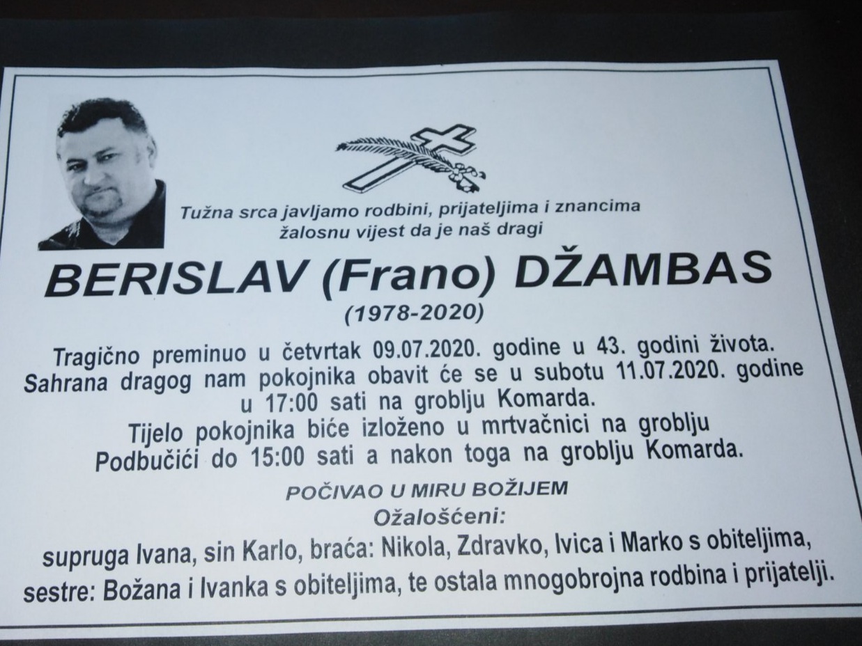 Sahrana tragično preminulog Berislava održat će se u subotu 11.07.2020.godine u 17 sati na groblju Komarda, a tijelo pokojnog biti će izloženo u mrtvačnici u Bučićima do 15 sati.