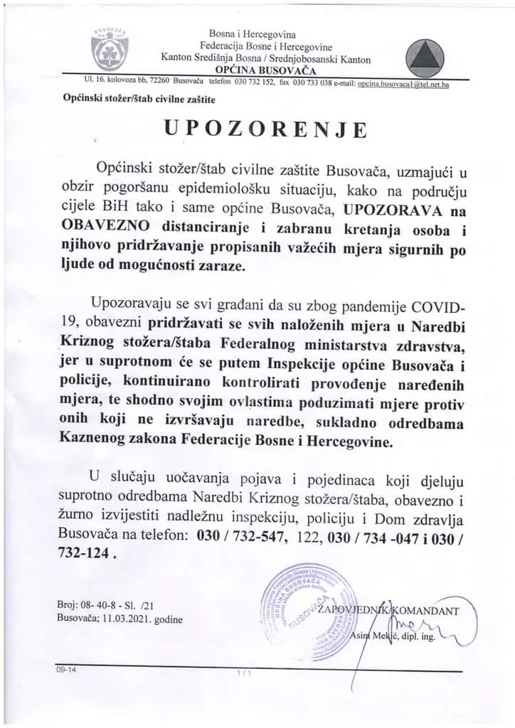 Općinski stožer civilne zaštite Busovača, uzimajući u obzir pogoršanu epidemiološku sitaciju, kako na području cijele BiH ako i same općine Busovača, UPOZORAVA na OBAVEZNO distanciranje i zabranu kretanja osoba i njihovo pridržavanje propisanih važećih mjera sigurnih po ljude od mogućnosti zaraze.