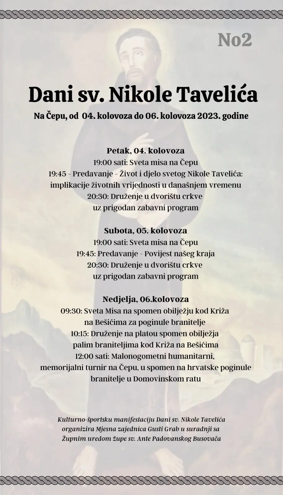 Manifestacija počinje u petak svetim misnim slavljem u 19,00 sati, koje će predvoditi vlč. Vedran Ćosić, koji će nakon mise održati kratko predavanje o životu i djelu svetog Nikole Tavelića: implikacije životnih vrijednosti u današnjem vremenu. Nakon predavanja predviđeno je druženje svih nazočnih uz prigodan zabavni program u dvorištu crkve sv. Nikole Tavelića na Čepu. Prisutne će zabavljati lokalni bend, pjevačka skupina HKUD fra Karlo Kujundžić Brestovsko i Izvorna pjevačka skupina Sv. Anto Busovača.