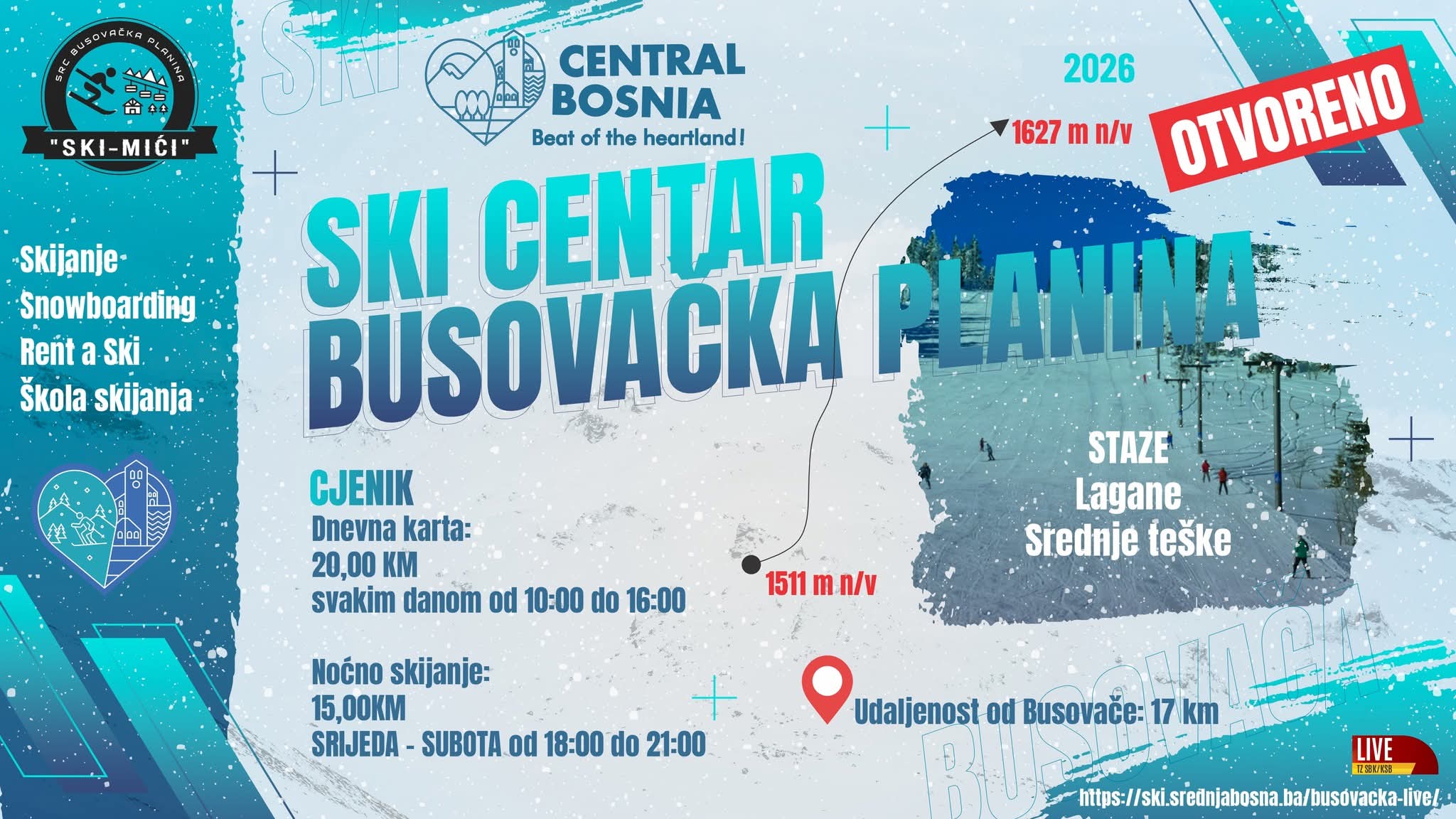 Otvaranje Ski centra Busovačka planina dodatno obogaćuje zimsku turističku ponudu kantona, a iz Turistička zajednica SBK/KSB pozivaju sve građane i goste da uživaju u zimskim radostima na Busovačkoj planini.