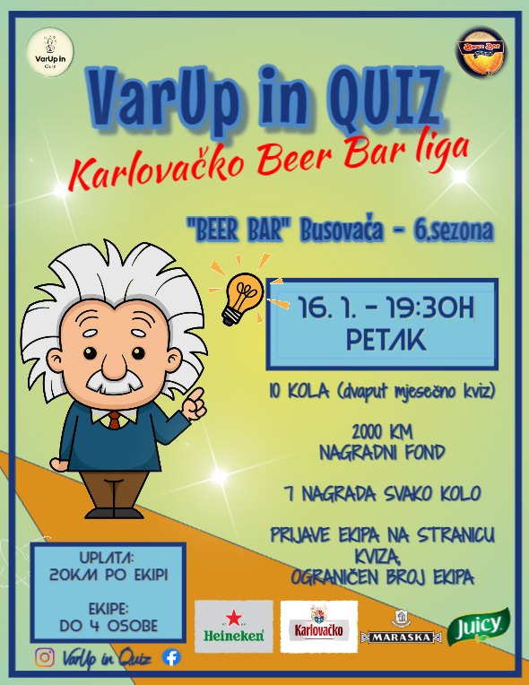 Ljubitelji kvizova i dobre atmosfere ponovno dolaze na svoje u Busovači. U petak, 16. siječnja, s početkom u 19:30 sati, u Beer Baru održava se novo kolo VarUp in Quiz – Karlovačko Beer Bar lige, u okviru šeste sezone ovog sve popularnijeg kviza.