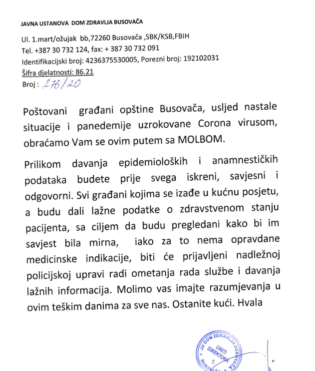 VAŽNA OBAVIJEST IZ DOMA ZDRAVLJA BUSOVAČA