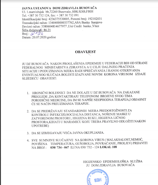 JU DZ Busovača nakon proglašenja epidemije u FBiH od strane Federalnog ministarstva zdravstva, a u cilju daljnjeg praćenja situacije i poduzimanja mjera radi sprečavanja i ranog otkrivanja eventualnog slučaja bolesti izazvane novim korona virusom, izdaje sljedeću obavijest: