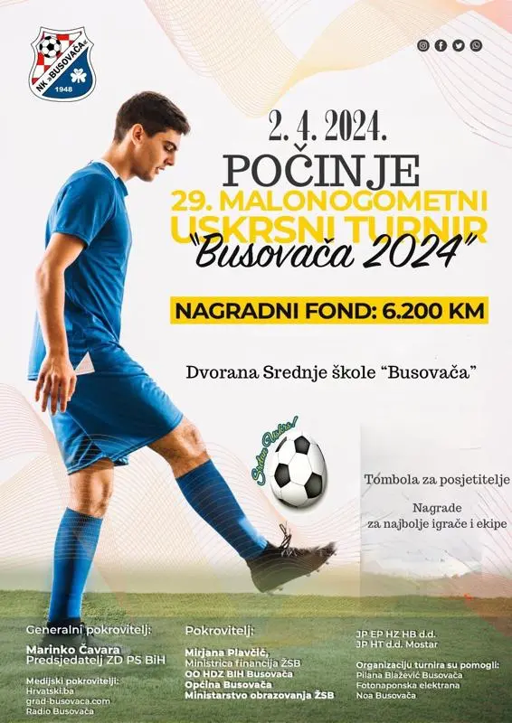 U utorak, 2. travnja, u dvorani Srednje škole “Busovača”, s početkom u 18.15 sati bit će upriličeno otvorenje 29. malonogometnog uskrsnog turnira “Busovača 2024”, koji organizira Nogometni klub “Busovača”.