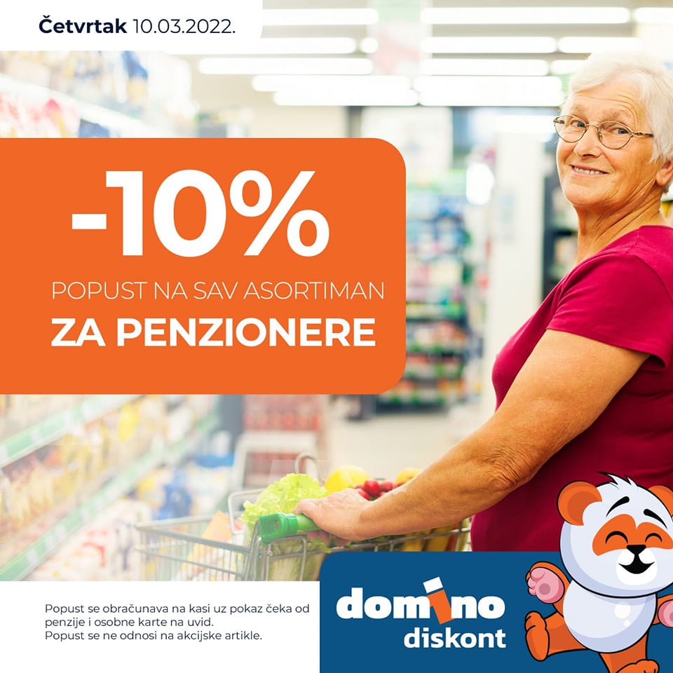 Svakog četvrtka umirovljenici će u Domino diskontu imati popust od -10 % na cjelokupni asortiman.