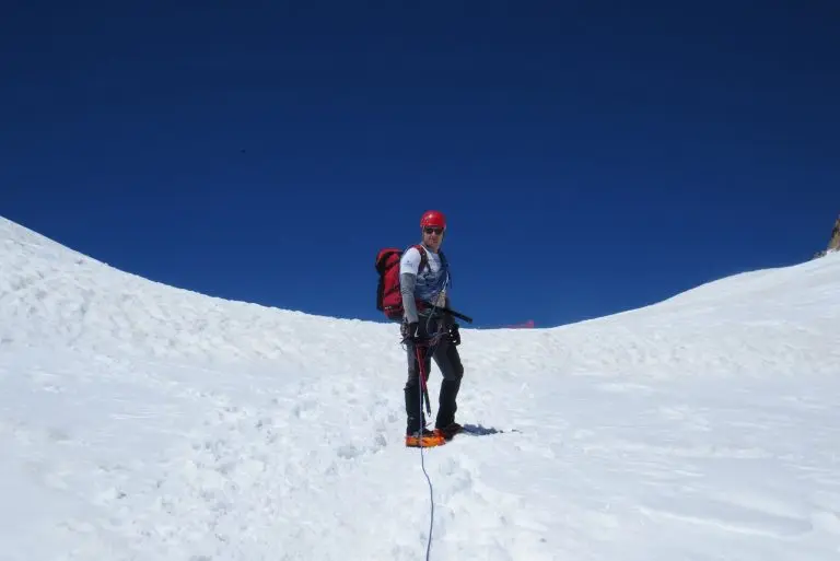Nije najpraktičnije bilo ići jedan za drugim. Jedan zapne, drugi se pati sa sajlom koja ga vuče sebi te na taj način gubi ravnotežu. Nakon prvih pet, mudrija odluka bila prelazak po dvoje. Imali smo sreću, nitko nije morao nazad zbog kotrljajućeg kamenja. A sreća nas je pratila i što se vremena tiče, cijelim putem je sunčano i bez vjetra. Počinje uspon stijenama. Nagib je ponegdje bio u potpunosti vertikalan, ali uglavnom od 30 do 60 stupnjeva. Sajle i klinovi su tu ukoliko se ne netko ne osjeća sigurno te su se pojedini mudro kačili na sajlu. Navezivanje po ovakvim stijenama za razliku od ledenjaka i snijega, nije mudro. Jer ako netko pada, onda padaju svi. Jedno po jedno, polako, zamka za zamkom, svako je na svoj način penjao.