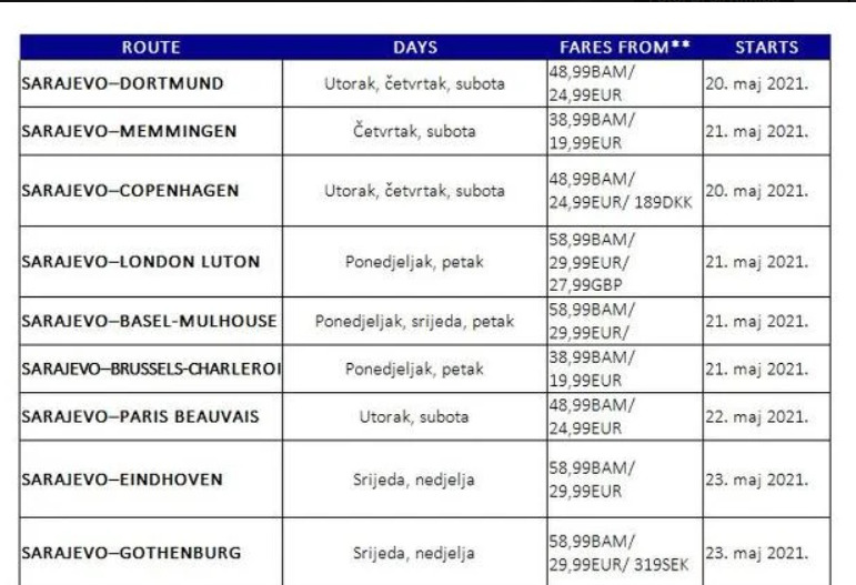 Osim uspostavljanja nove baze, Wizz Air je od svibnja 2021. najavio i pokretanje devet novih ruta iz Sarajeva ka gradovima u sedam zemalja. Mjesta na novim letovima već se mogu rezervirati na wizzair.com ili putem mobilne aplikacije aviokompanije po cijeni već od 38,99 BAM/19,99 eura.