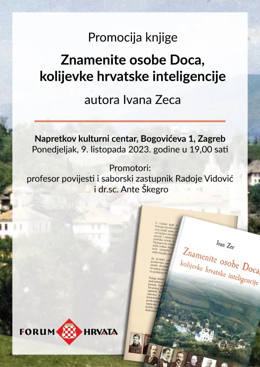 Predstavljanje knjige autora, zagrebačkog Travničanina, Ivana Zeca, „Znamenite osobe Doca, kolijevke hrvatske inteligencije“ bit će upriličeno u Napretkovom kulturnom centru u Zagrebu, na adresi Bogovićeva 1, u ponedjeljak, 9. listopada, s početkom u 19,00 sati.