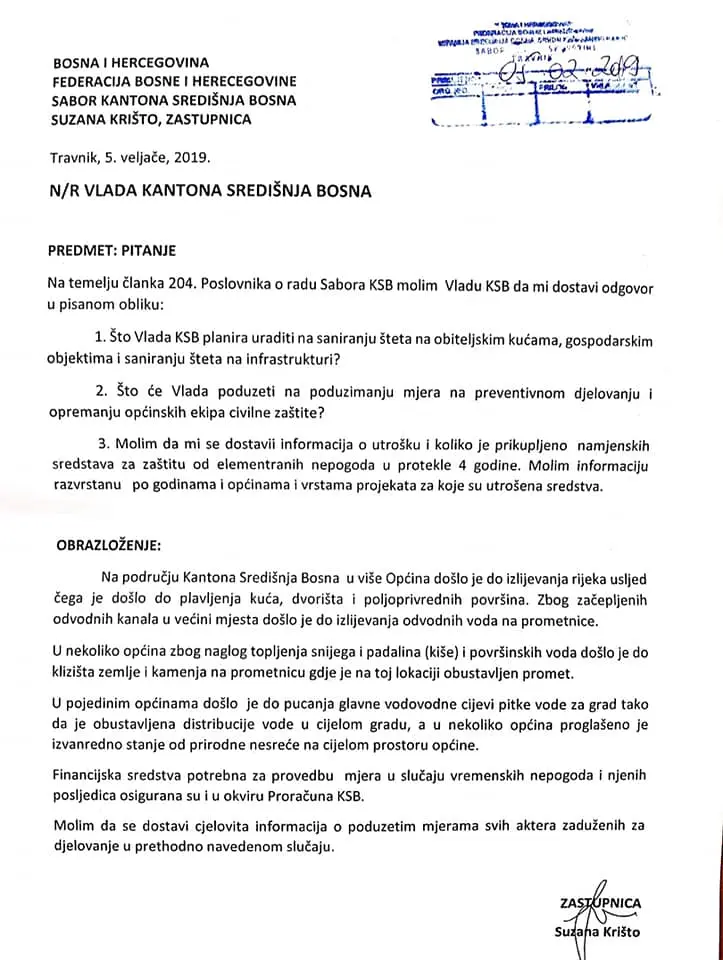 Zbog izvanrednog stanja izazvanih prirodnim nepogodama, zastupnica u Saboru KSB Suzana Krišto je jučer uputila pitanja Vladi ŽSB s ciljem žurne pomoći oštećenima u poplavi.